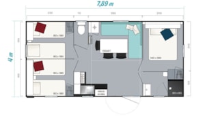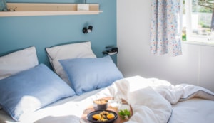 Mobile home Comfort Deluxe3 bedrooms | approx. 32-34 m² (max. 3 + 3 persons)Our Mobile home Comfort Deluxe (max.6 persons) is approx. 32-34 m². Ideal for families who like to have some space. The accommodations have enough space in between to enjoy the peace during your holiday. The mobile home offers place for 6 persons. The Comfort Deluxe mobile homes at campsite Borken am See have a heating system, causing that it is also comfortable to have a holiday in pre and late season. Max 3 adults and 3 children. View the location of the Comfort deluxe mobile home on the Map