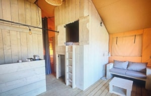 Safaritent Cottage with shower & toilet3 bedrooms | ca. 39 m² (max. 3 + 3 pers.)This cosy Safari Tent Cottage is one of our most luxurious and comfortable safari tents. Ideal for families who love space. The safari tents have efficient and modern furnishings. The Safari Tent Cottage has two bedrooms enclosed by scaffolding walls; one with a double bed and one with a bunk bed. The unique feature of this safari tent is the cosy double cupboard bed with a play area underneath for the little ones. Of course, you can also use this space as storage for suitcases or groceries, for example.
