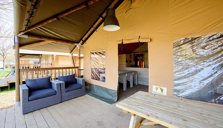 Lay out Safari Tent Cottage with sanitary facilitiesLiving room with cosy seating area and dining table for 6. Fully equipped open kitchen with tall fridge with freezer compartment, 4-ring gas hob, kettle, Nespresso machine and dishwasher. Master bedroom with double bed (140 x 195), bedrooms with bunk bed (80 x 195), and bedroom with cosy cupboard bed for 2 persons. Bathroom with washbasin, shower and toilet. The spacious covered wooden veranda is equipped with 2 lounge chairs with all-weather cushions, picnic table with 2 benches, hammock and outdoorchef gas barbecue. Glamping with a capital G! | |||||